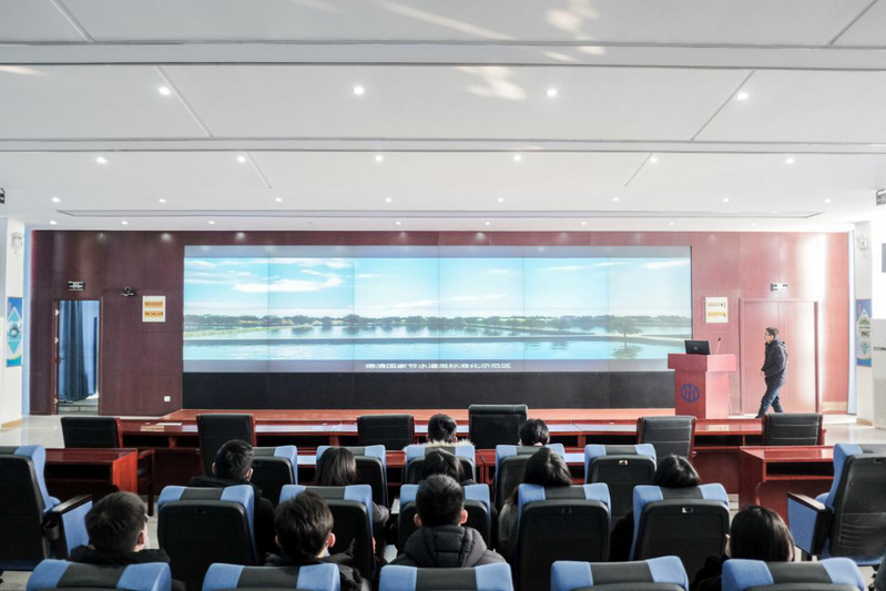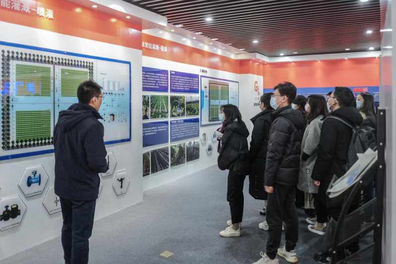 在一楼高效节水智能化灌溉展厅,讲解人员详细介绍了节水设备的发展历史、示范园区的设计规划以及先进的节水智能设备,为同学们拓宽专业知识应用提供了经验。