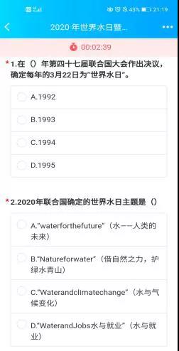 讲座结束后随即举行以“世界水日,中国水周,节水优先”为主要内容的知识竞赛,竞赛题目包括此次讲座中陈经理关于水系保护的相关研究、中国河流以及国内关于水的相关管理制度,同学们积极参与答题!