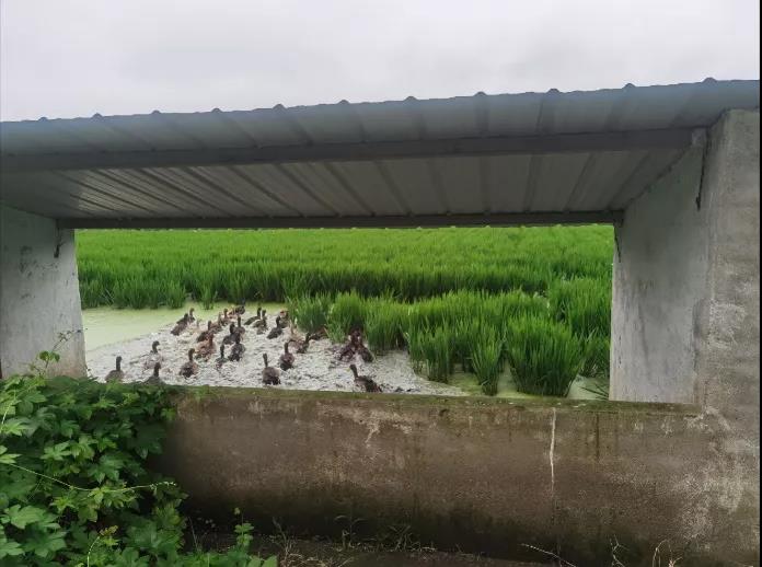 调研团向稻鸭基地管理人员了解稻鸭共生模式的具体情况,包括鸭苗投入量、投入时间、水稻和生态鸭产量、投入产出等内容并深入田间察看鸭稻生长情况。三河镇稻鸭共生示范区面积1545亩,每亩平均投放5~8只鸭,在水稻分蘖中期投放,在水稻抽穗前收获,在此期间水稻田间保持10cm左右水层以及农渠保持较高水位供鸭子活动和觅食,在稻鸭田四周建有防逃逸网,在稻田南北两侧建有鸭舍,供鸭子栖息和补充投喂饲料。通过稻鸭共生模式的培育,提高了经济效益。