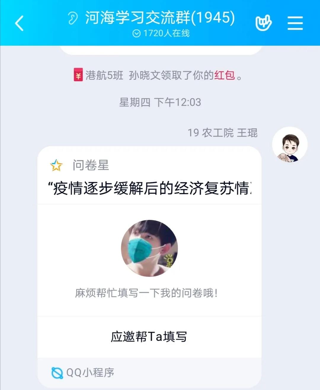 2020年8月8日至9日,农工院2019级农业水利工程专业王琨同学开展了以疫情逐步缓解后我国经济复苏情况为主题的社会调研,本次调研通过线上发送调查问卷收集各方面信息,通过线上采访市民了解疫情后经济恢复情况,最终通过处理分析调查数据得到了详细丰富的调研报告,调研活动圆满结束。