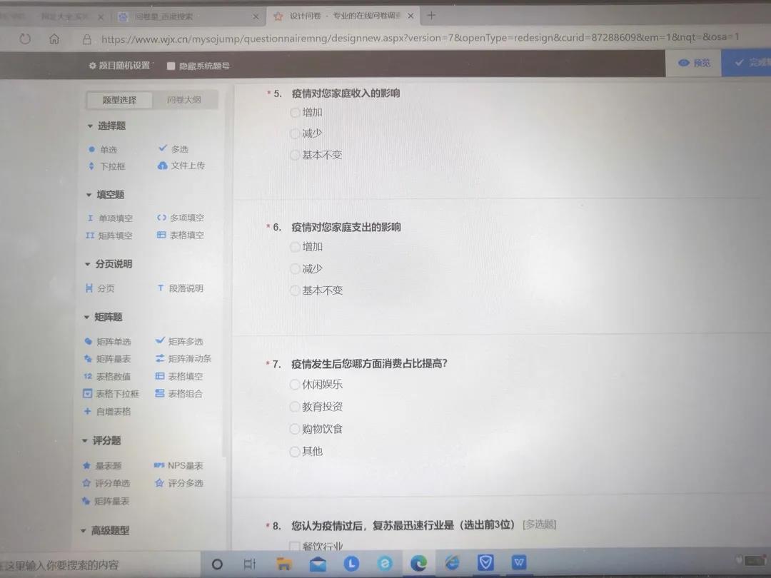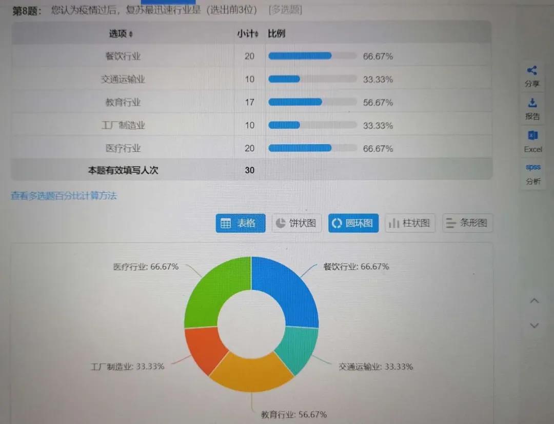 本次调查问卷共有14个题目,内容主要涉及疫情对受访者家庭工作的影响,以及受访者对其所在城市采取的恢复经济措施的认识和评价,受访人员来自河北、江苏、山东、重庆、安徽等11个省,分布较为广泛。问卷的第5题,有40%的受访者选择了疫情导致家庭收入减少,56%的受访者表示疫情到来后家庭收入基本不变,仅有4%的受访者认为疫情到来后家庭收入增加,说明疫情对大多数家庭的收入产生了负面影响或者影响不大,推测少部分家庭因为工作性质的原因在疫情中收入增加。问卷的第7题,对于在疫情发生后居民的哪方面消费占比增加,将近57%的受访者选择了购物饮食,可见疫情使得人们更加注意粮食安全,对基本生活饮食方面投入加大。问卷的第8题表明,人们普遍认为餐饮、教育、医疗三大行业为疫情逐步缓解后复苏最为迅速的行业,这也符合这三个行业和人民基本生活最为密切的特点。绝大多数受访者都表示所在城市采取了鼓励支持地摊经济的措施助力经济复苏,同时认为拓宽就业渠道为城市采取的最有效的助力经济复苏措施,说明疫情的到来使人们就业更加困难,就业困难成为影响居民收入、经济复苏的主要障碍。本次调研同时对部分市民采取了线上采访,以保证问卷调查所得数据的科学性。
