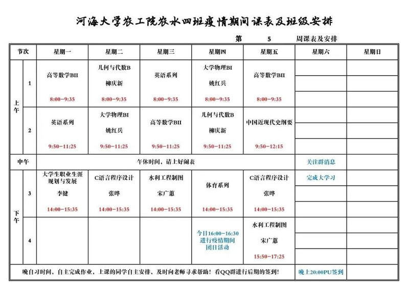 3月14日,农工院2019级农水四班团支部将第五周的安排及重要的事项发送至班级支部群中,同学们积极响应配合,按照团日活动的计划内容分享了自己疫情期间的感想,并及时上传了采访视频。