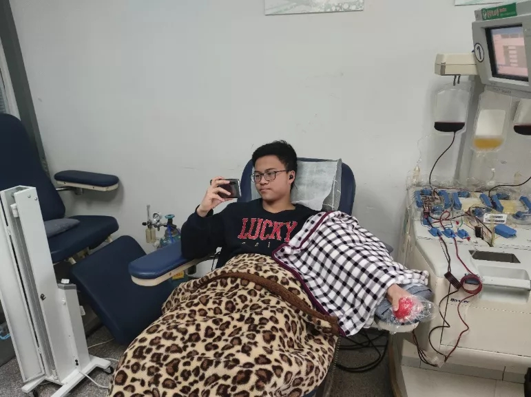 终于轮到了志愿者团队献血,大家走进献血室,认真聆听验血的医护人员讲解相关知识和可能引起的不良反应。待验血结束,志愿者们躺上献血床位。看着护士把一套崭新的抽血针管装在滤血机器上,志愿者们并未表现出一丝畏惧,而是勇敢地撸起了自己的袖子,伸出臂膀。献血的过程并不舒适,手臂中的血液被抽走,使人感觉时冷时热,但是献血室内的气氛愉快而轻松,大家抑或听音乐放松,抑或闭目养神。医护人员也忙前跑后,询问志愿者的身体情况,并记录下实时数据。有时输血阻滞,他们会第一时间前来进行机器调试,确保采血的顺利进行。