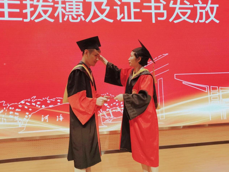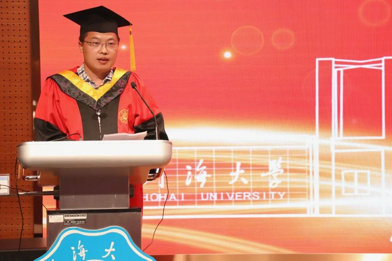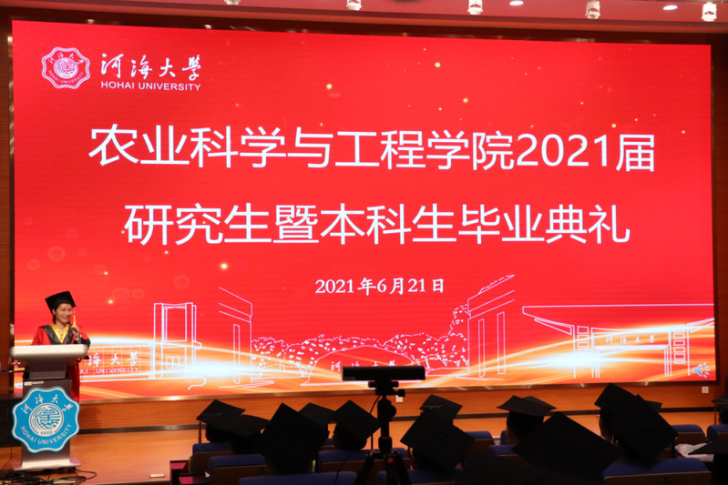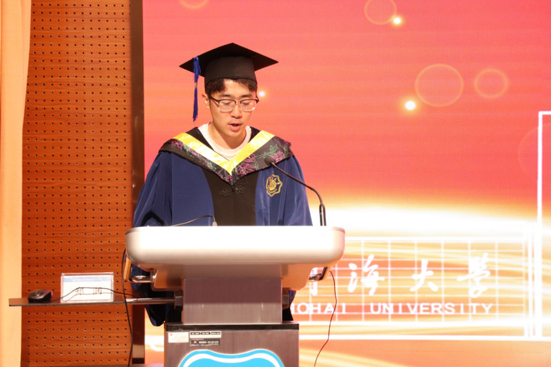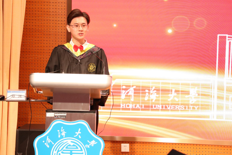 研究生毕业生代表赵思远、本科毕业生代表孙传喆回顾了在河海难忘的学习生活记忆,衷心感谢每位老师的悉心指导和关怀,向所有携手共进的同窗好友们道一句珍重,并祝愿全体毕业生前程似锦。无论身处何方,无论从事何种工作,都要牢记“艰苦朴素、实事求是、严格要求、勇于探索”的校训,立鸿鹄之志,为国家和社会贡献自己的力量。
