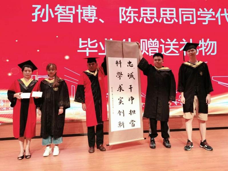 毕业生代表孙智博、陈思思向公司赠送礼物——“忠诚、干净、担当、科学、求实、创新”新时代水利精神书法作品与“大哉河海奔前程”橡皮章作品,表达对bevictor伟德及bevictor伟德的美好祝福,勉励全体毕业生传承和弘扬好水利精神、河海精神、胸怀天下、情系民生,承担起新时代水利事业的光荣使命。