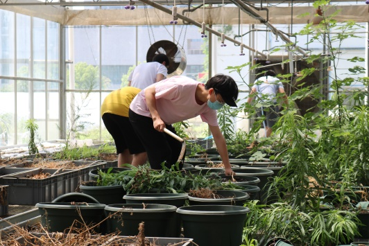 为栽种不同作物做准备工作,2021年6月4日上午,农业水利工程19级员工于节水园区的大棚内清理杂草、打扫卫生。