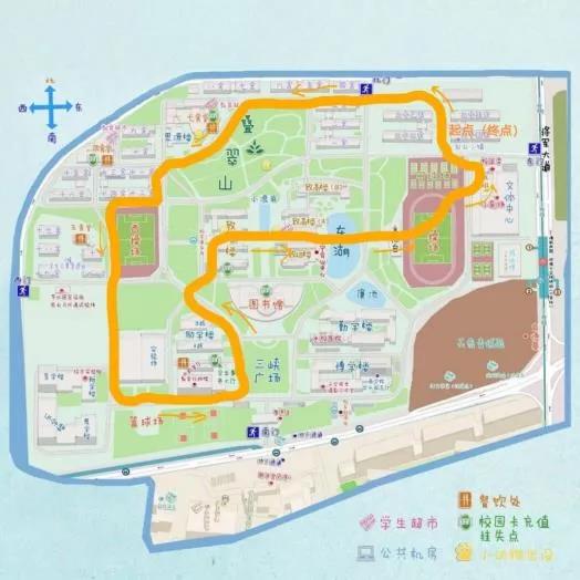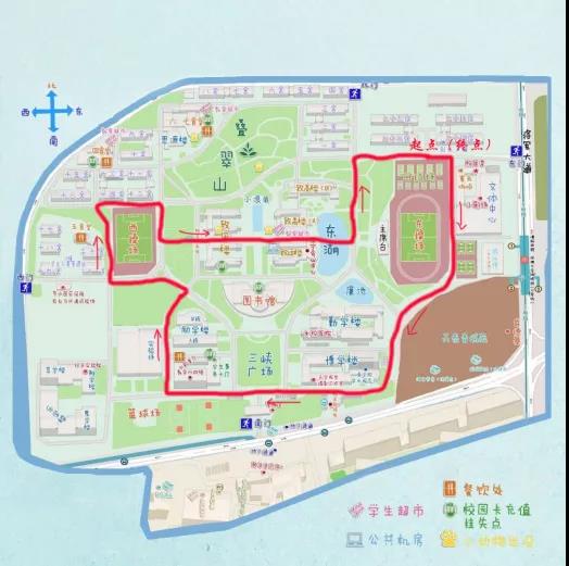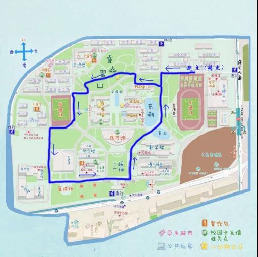 22、24舍(出发)→①新新食堂一楼门口→②思源书吧门口→③试验田外围→④行政楼四楼C402(员工活动室)→⑤励学楼105教室门口→⑥致用楼208教室门口→⑦致远楼206教室门口→⑧东湖静思桥→⑨体育场观众席→22、24舍(结束)