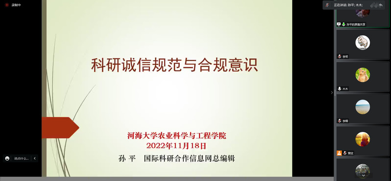 为加强科研诚信建设,加大科研诚信、学术规范的宣传教育力度,营造良好学术道德氛围,2022年11月18日下午,公司在江宁校区行政楼401室举办“学术规范和学术诚信”讲座,邀请国际科研合作信息网总编辑孙平博士为农工院全体师生作题为“科研诚信规范与合规意识”的报告,讲座由副经理徐俊增教授主持,采用线下与线上相结合的方式进行。