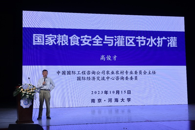 随后,高俊才司长为师生作“国家粮食安全与灌区节水扩灌”主旨报告。他强调,粮食安全来之不易,巩固提高仍需努力,要保持居安思危,巩固提高国家粮食安全水平,深入贯彻“以我为主、立足国内、确保产能、适度进口、科技支撑”的国家粮食安全战略。他指出,提升国家粮食安全,要坚持“五良融合配套”,并就良田、良种、良法、良机和良制阐述了各自的工作重点以及相互融合的思路。最后,针对安徽淠史杭、四川都江堰、内蒙河套三个特大型灌区正在开展的节水、扩灌规划,介绍了各自在灌区节水、扩灌、增粮、增效方面的拟开展的具体工作。他强调要坚持节水增效与开源增水相结合,工程与机制“两手抓,两手硬”,政府与市场要“两手发力”,才能更好地实现国家增粮、农民增收、灌区增效、生态增绿的有机统一。