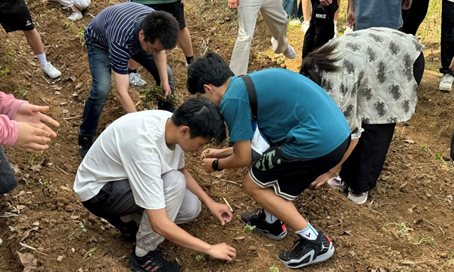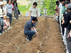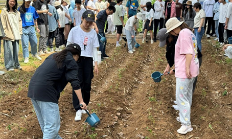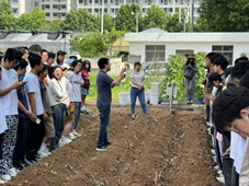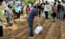 此次劳动教育活动的内容是种植红薯苗。丁老师细致地为同学们讲解了种植的要领,并和张副经理一起亲自演示。随后,同学们从老师的手中接过新鲜的红薯苗,兴致勃勃地投入到种植红薯的劳动实践当中去,用心体悟劳动的意义。