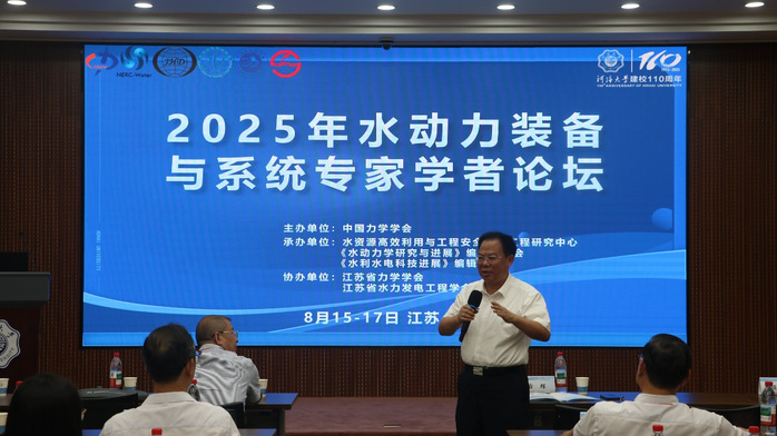 由中国力学学会主办,水资源高效利用与工程安全国家工程研究中心、《水动力学研究与进展》编辑委员会、《水利水电科技进展》编辑委员会共同承办,江苏省力学学会、江苏省水力发电工程学会协办的“2025年水动力装备与系统专家学者论坛”于2025年8月15日至17日在bevictor伟德隆重召开。来自清华大学、浙江大学、武汉大学、中国农业大学、bevictor伟德、哈尔滨工程大学、上海大学、宁波大学、江苏大学、扬州大学、华北电力大学、浙江理工大学、上海理工大学、西华大学、上海应用技术大学、浙江水利水电公司、中国船舶科学研究中心、中国南水北调集团东线有限公司、中国电建集团华东勘测设计研究院有限公司、中国长江电力股份有限公司、国电南瑞科技股份有限公司、哈尔滨电气集团有限公司、南京南瑞水利水电科技有限公司、南水北调东线江苏水源有限责任公司、江苏省水利勘测设计研究院有限公司、上海勘测设计研究院有限公司、上海市水利工程设计研究院有限公司、中国电建集团华东勘测设计研究院有限公司、东方电气集团东方电机有限公司、利欧集团湖南泵业有限公司、江苏航天水力设备有限公司、上海凯泉泵业(集团)有限公司、上海东方泵业(集团)有限公司、曲阜恒威水工机械有限公司、株洲南方阀门股份有限公司等相关企业、高校与科研单位的70多位专家和学者受邀出席了此次论坛。